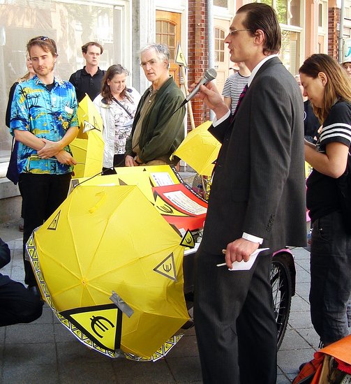 24 mei 2008 Zaterdag 24 mei 2008 organiseerde actiegroep Stop Speculatie in samenwerking met het Spekulatie Onderzoekskollektief (SPOK) voor bewoners van de Transvaalbuurt een informatieve wandeling langs panden waarmee gespeculeerd wordt. De actiegroep wil hiermee speculatie en de panden waarmee dat anno 2008 gebeurt meer laten opvallen. De actiegroep maakt zich ernstige zorgen over de gevolgen van speculatie voor de huisvestingsmarkt. Onderzoek van het SPOK signaleert dat het een gewoonte is geworden dat huurderspanden meerdere malen worden doorverkocht. Handelaren willen de huurders laten verhuizen en de panden splitsen en vervolgens als appartementen verkopen. Daar aan voorafgaand heeft het vele doorverkopen, zonder dat er in de panden geinvesteerd wordt, ook al fikse prijsstijgingen tot gevolg. Deze prijsstijgingen drijven de woonlasten voor de toekomstige eigenaar-bewoners enorm op. Er zijn situaties bekend dat renovaties worden afgeraffeld, waardoor kopers met onvoorziene verbouwingskosten worden opgezadeld. Ook verdwijnen in veel gevallen onnodig betaalbare huurwoningen. Door de winsten die gemaakt kunnen worden, wordt het verdrijven van huurders beloond en komt de grens voor intimiderende tactieken later te liggen. In de Transvaalbuurt en dan met name in een grote straat als de Pretoriusstraat met veel particulier bezit slaan speculanten ongenadig hun slag. Zij worden hierin geholpen door het splitsingsbeleid en het tekortschietende toezicht bij de overheid. de presentatie inhoudelijk: Presentatie methodiek en panden fotoverslagen: Indymedia: Foto's speculatiewandeling Transvaalbuurt - A'dam |